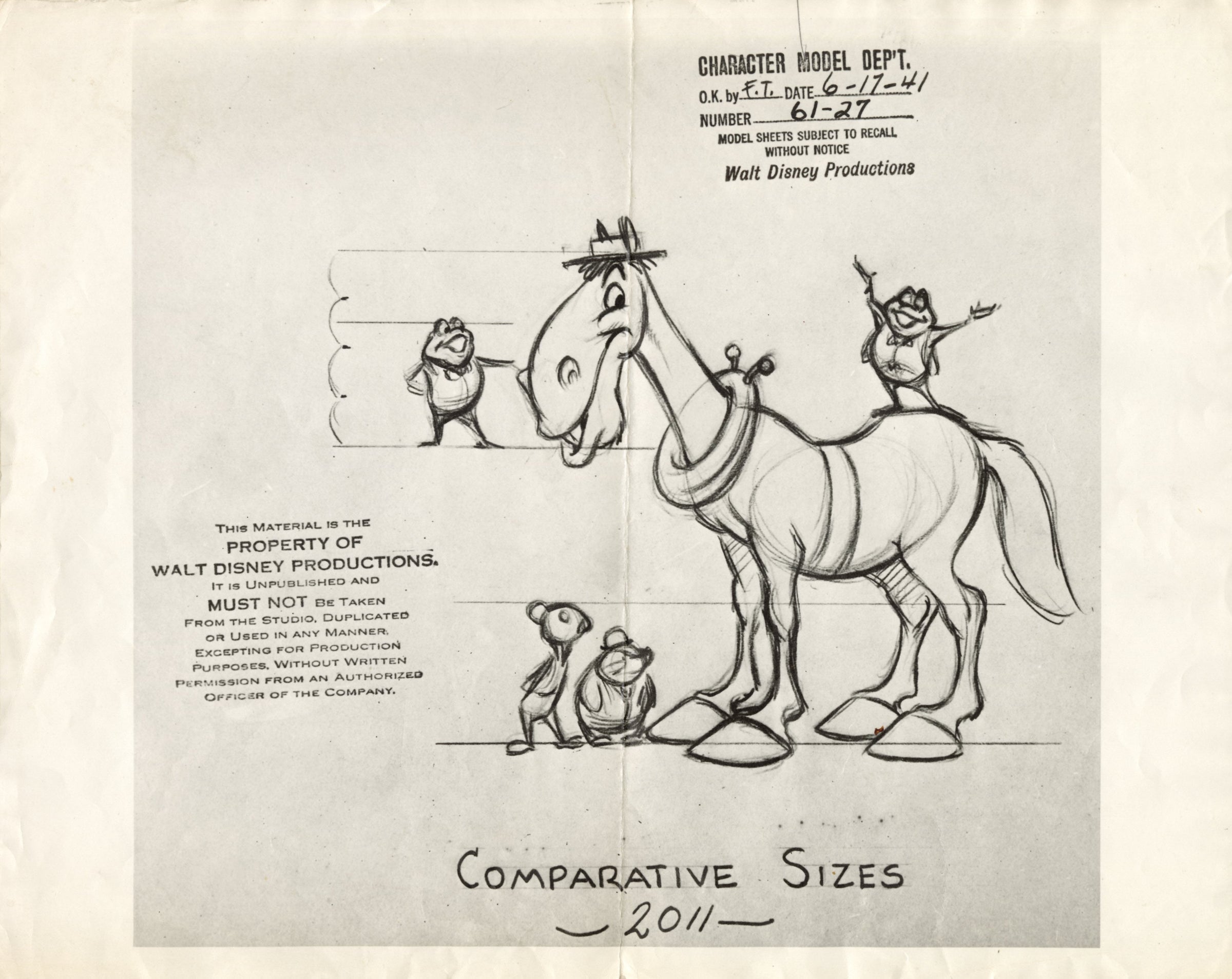 This piece shows signs of production wear: center crease and wrinkling along edges. The embedded date on this model sheet reads June 17th, 1941 and includes the initials of Frank Thomas, the supervising animator.