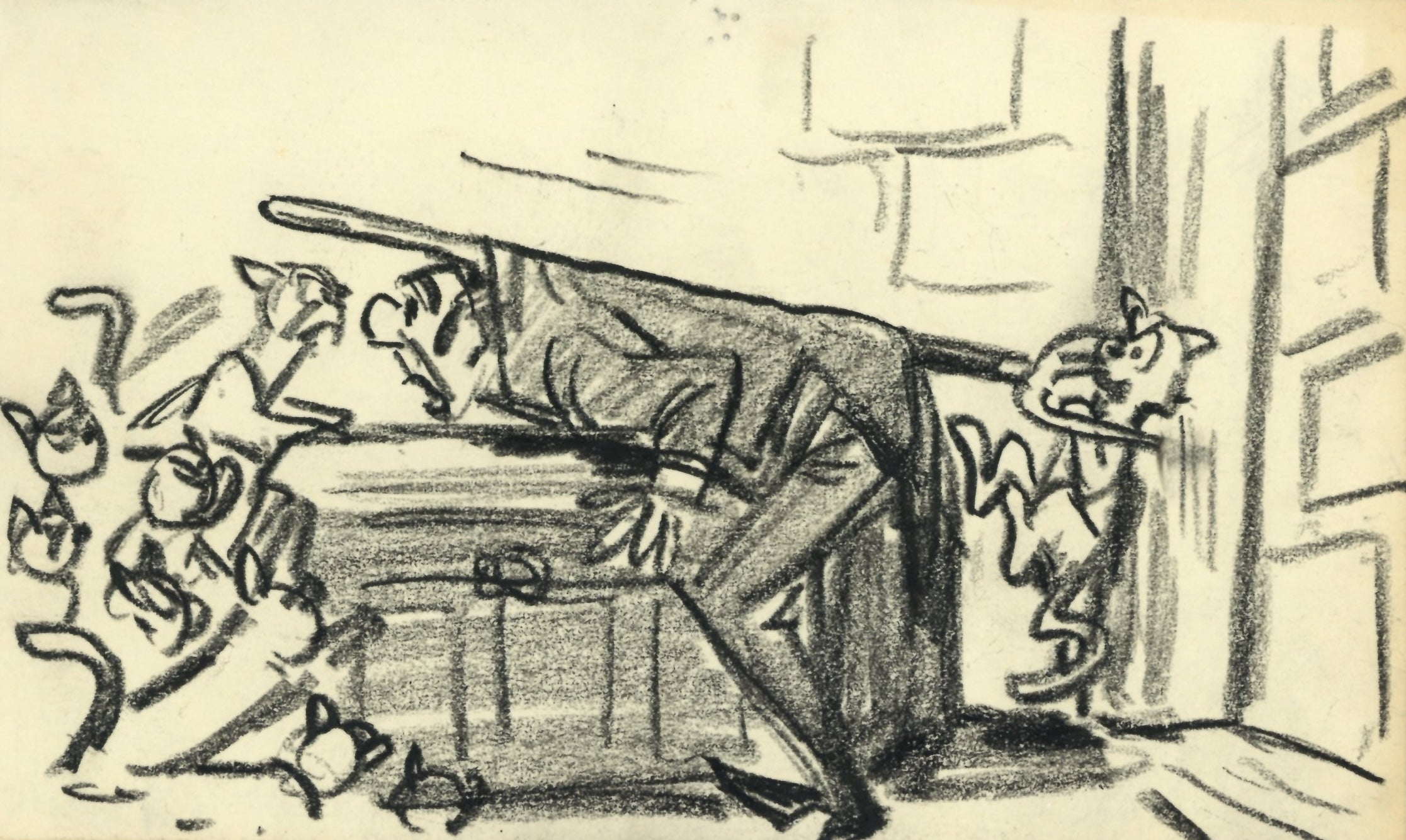 ABOUT THE IMAGE: This storyboard showcases the creativity involved in the making of The Aristocats. It was created for climactic sequence starting at about 1:12:52 when Edgar locks Duchess and her kittens in a trunk, ready to ship them off for good. O'Malley, Roquefort, Frau, and even Scat Cat and the Alley Cats help to stop him and make sure he's the one who is sent to Timbuktu. The artist of this storyboards is thought to be Vance Gerry (1929 - 2005), a storyboard, layout, and character artist at Disney for nearly 50 years.