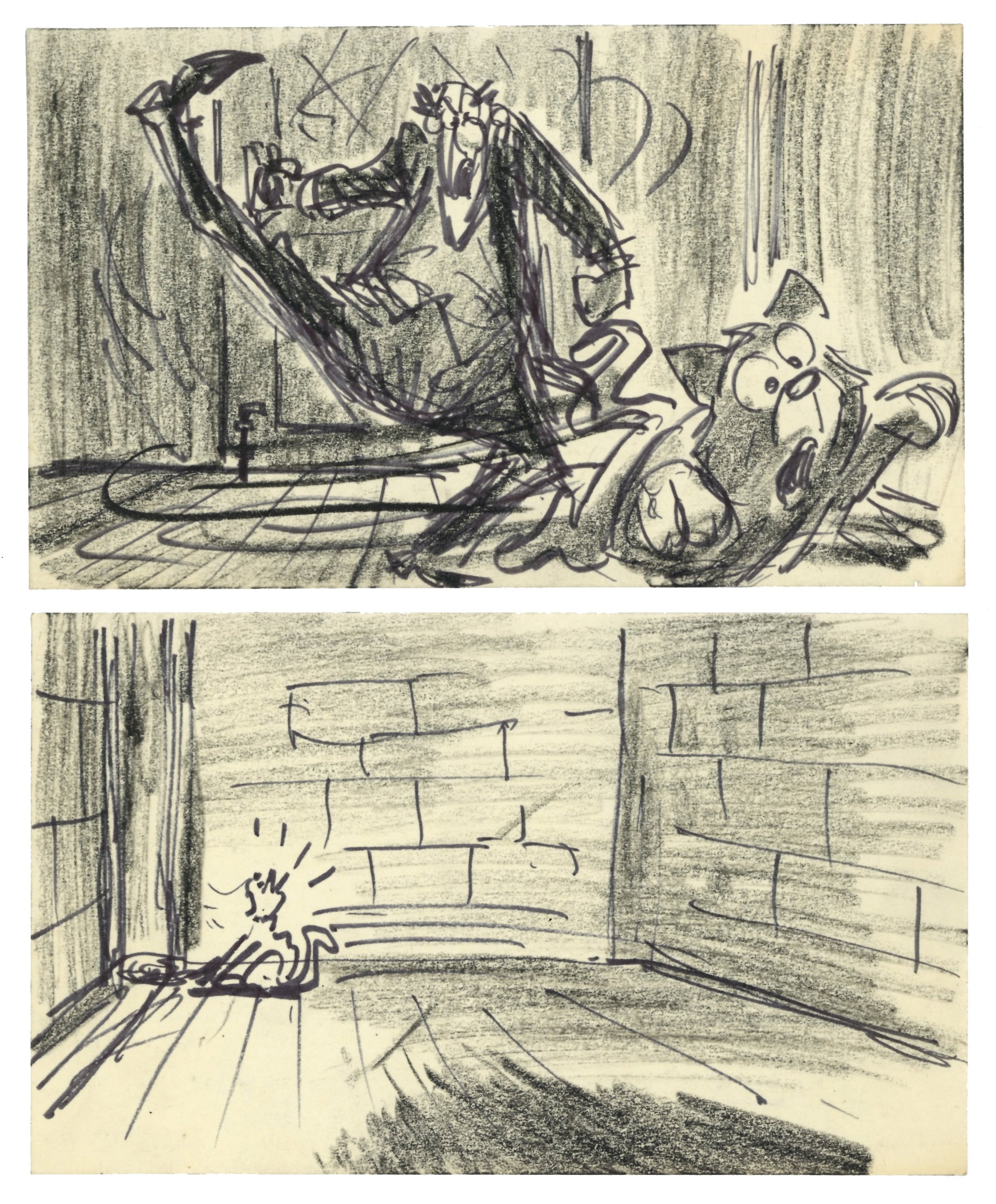 ABOUT THE IMAGE: These storyboards showcase the creativity involved in the making of The Aristocats. They were created for climactic sequence starting at about 1:12:52 when Edgar locks Duchess and her kittens in a trunk, ready to ship them off for good. O'Malley, Roquefort, Frau, and even Scat Cat and the Alley Cats help to stop him and make sure he's the one who is sent to Timbuktu. The artist of these storyboards is thought to be Vance Gerry (1929 - 2005), a storyboard, layout, and character artist at Disney for nearly 50 years.