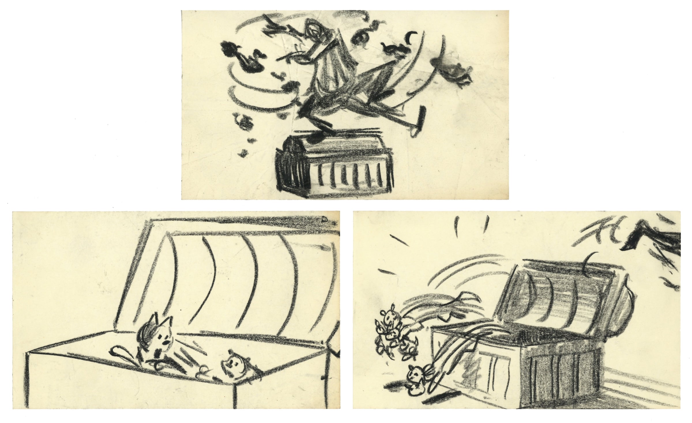 ABOUT THE IMAGE: These storyboards showcase the creativity involved in the making of The Aristocats. They were created for climactic sequence starting at about 1:12:52 when Edgar locks Duchess and her kittens in a trunk, ready to ship them off for good. O'Malley, Roquefort, Frau, and even Scat Cat and the Alley Cats help to stop him and make sure he's the one who is sent to Timbuktu. The artist of these storyboards is thought to be Vance Gerry (1929 - 2005), a storyboard, layout, and character artist at Disney for nearly 50 years.