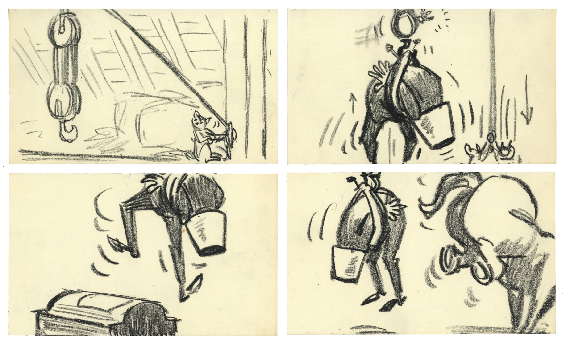 ABOUT THE IMAGE: These storyboards showcase the creativity involved in the making of The Aristocats. They were created for climactic sequence starting at about 1:12:52 when Edgar locks Duchess and her kittens in a trunk, ready to ship them off for good. O'Malley, Roquefort, Frau, and even Scat Cat and the Alley Cats help to stop him and make sure he's the one who is sent to Timbuktu. The artist of these storyboards is thought to be Vance Gerry (1929 - 2005), a storyboard, layout, and character artist at Disney for nearly 50 years.