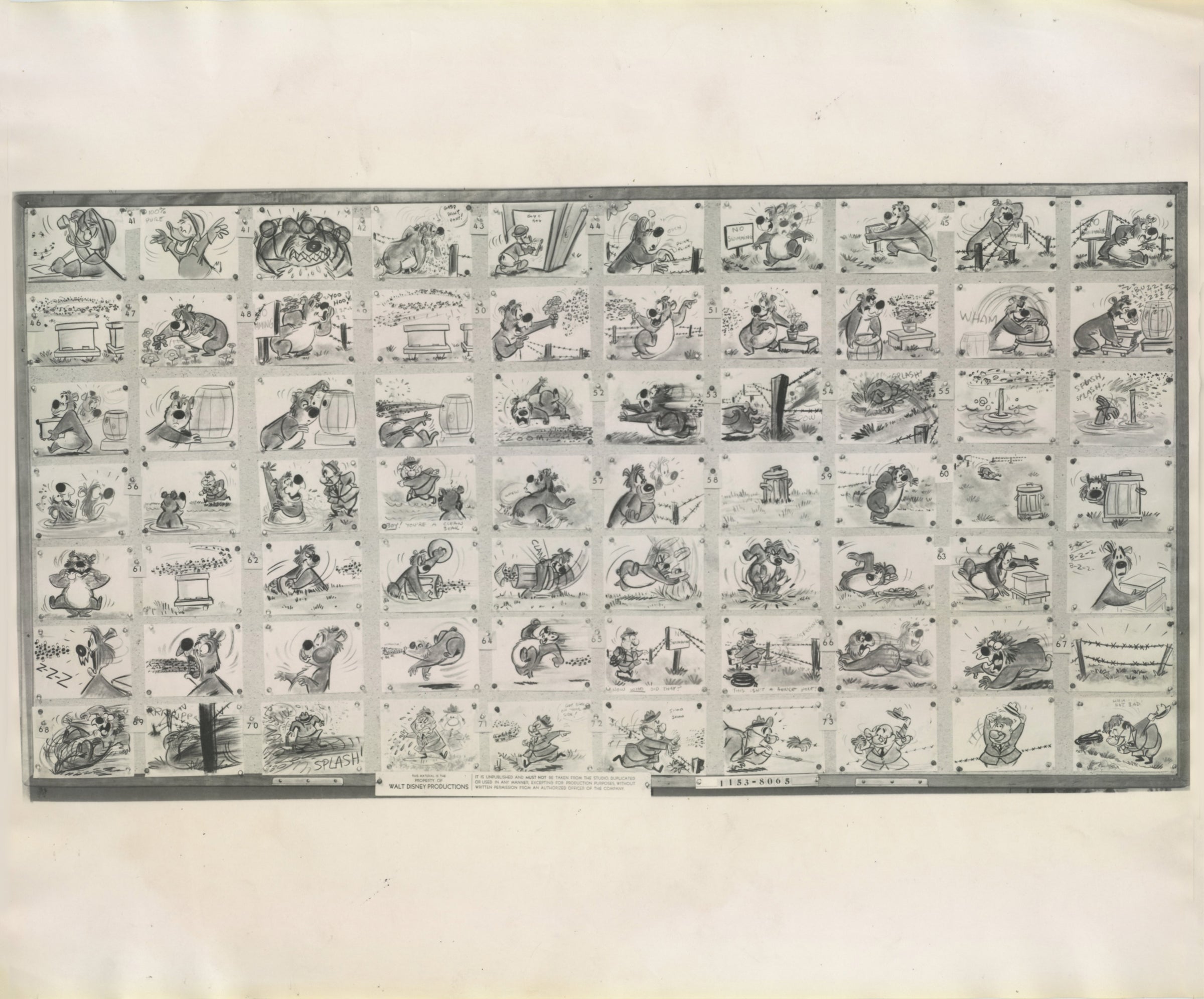 ABOUT THE MEDIUM: Storyboard Drawings show what’s moving in each shot, and in which direction, so that the production team is crystal clear on the desired end result. Photostat Storyboard Sheets are printed copies of the original storyboard drawings that were used by staff during the production of a film.