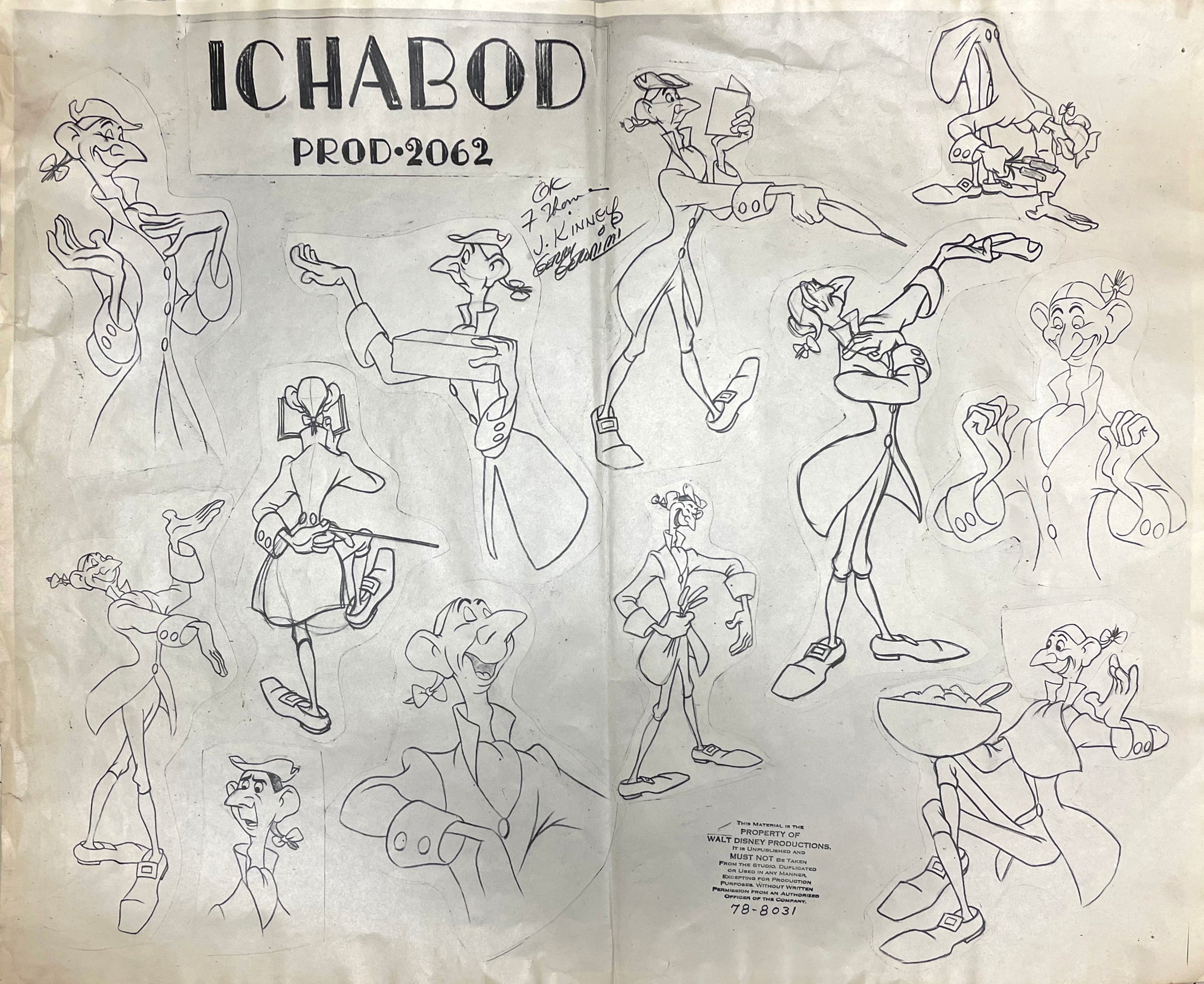 NOTES: "OK F. Thomas, J. Kinney, Gerry Geronimi," (written by Frank Thomas, Jack Kinney, and Clyde Geronimi) has been reproduced below the title of this model sheet. This piece shows signs of moderate production wear: center crease, edge wrinkling, and pinholes. Due to its size, this piece will be shipped rolled in a tube.