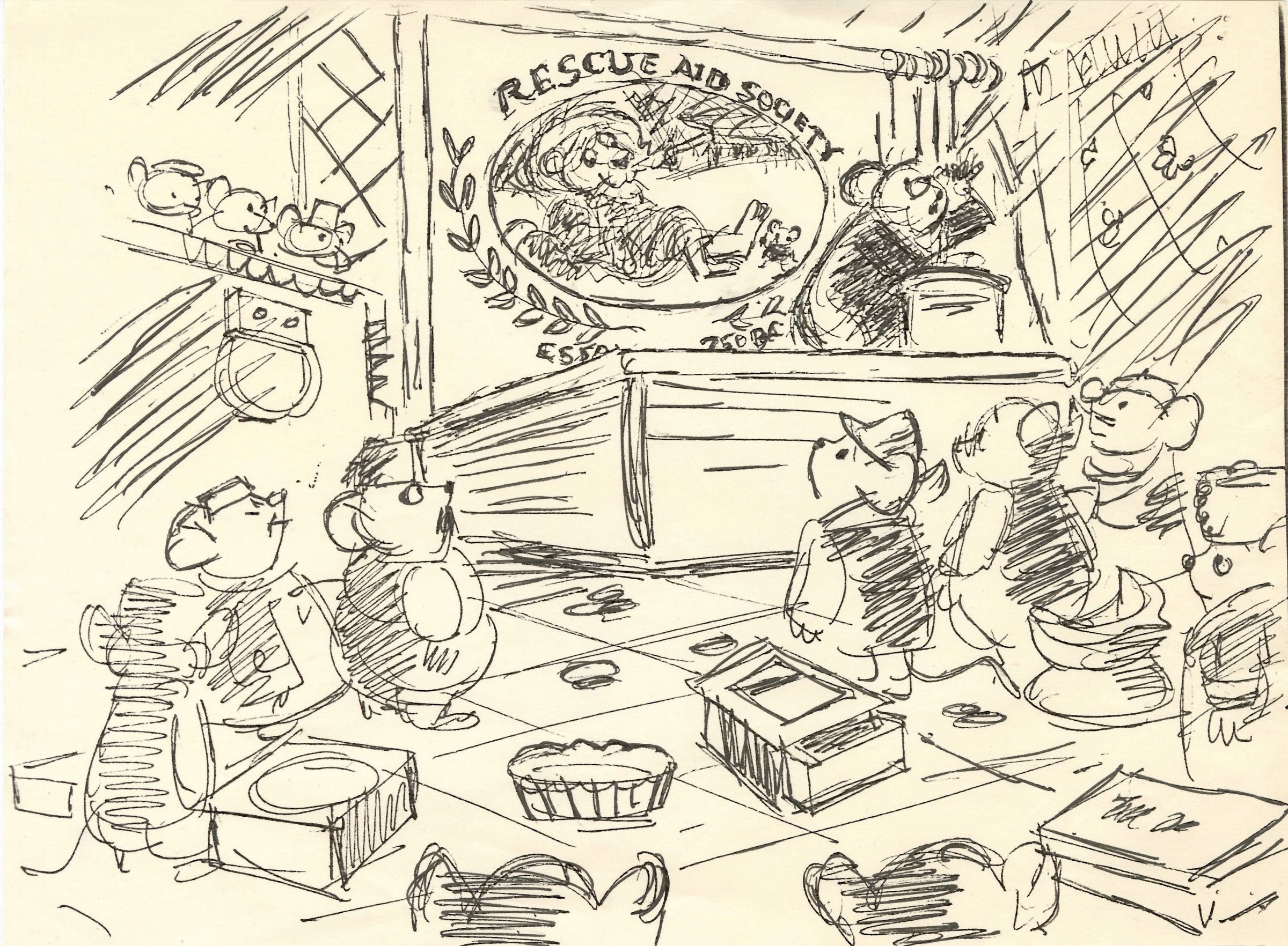 The storyboards were all created by the exceptional writer and story artist Ted Berman (1919 - 2001), who contributed to a variety of Disney films, shorts, and featurettes including The Black Cauldron and The Fox and the Hound. The storyboards and prints were largely created for: the sequence at the beginning of the film with the Rescue Aid Society where Bernard and Bianca are introduced, starting at roughly 6:22; the chase sequence where Madame Medusa, Mr. Snoops, and Medusa's crocodiles hunt Bernard and Bianca, starting at around 46:49; and the fight sequence at about 1:09:31 when Ellie Mae and crew help Bernard and Bianca fight off Madame Medusa.