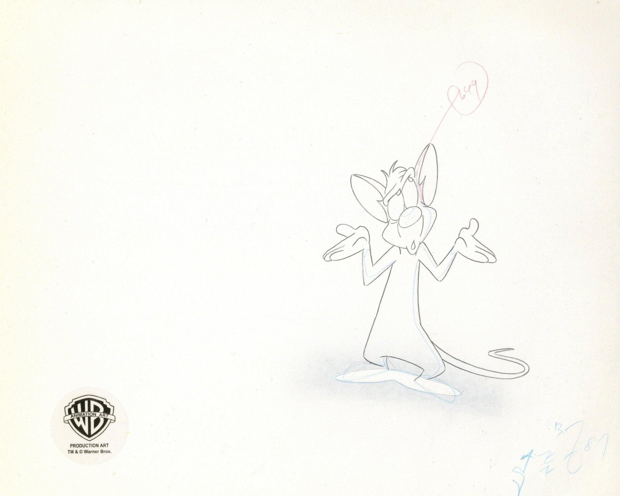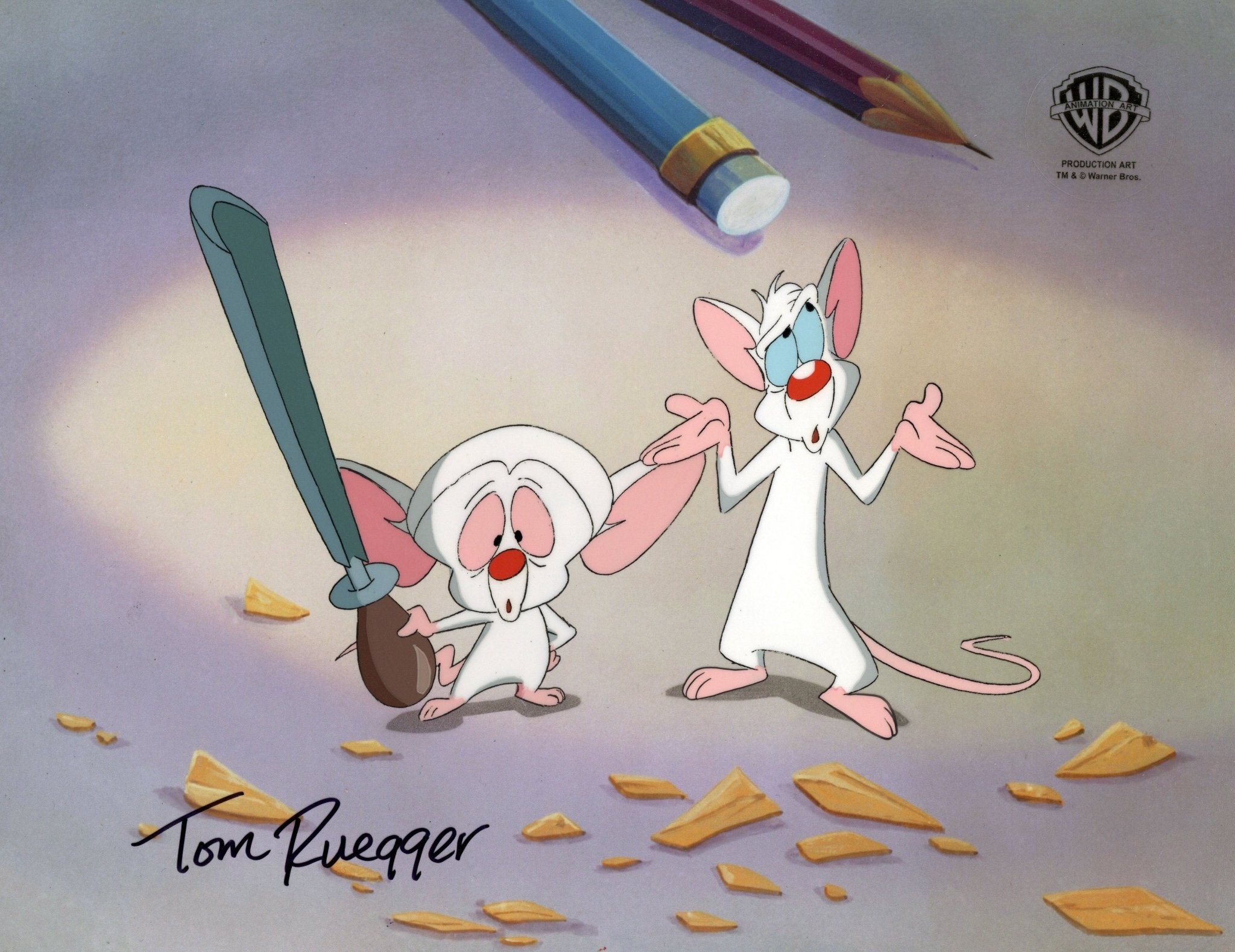 ABOUT THE IMAGE: Pinky and the Brain is a cartoon that follows a self-proclaimed genius, The Brain, and his dimwitted sidekick, Pinky, as they try to conquer the world. Pinky and the Brain was the first animated television series to be presented in Dolby Surround. It was created by Tom Ruegger and the fourth collaboration between Steven Spielberg's production company, Amblin Entertainment and Warner Bros. Animation. The characters first appeared in 1993 as a recurring skit on the show Animaniacs. Thanks to its popularity it was later spun off as a series. There were 66 episodes produced. This piece comes with a certificate of authenticity.