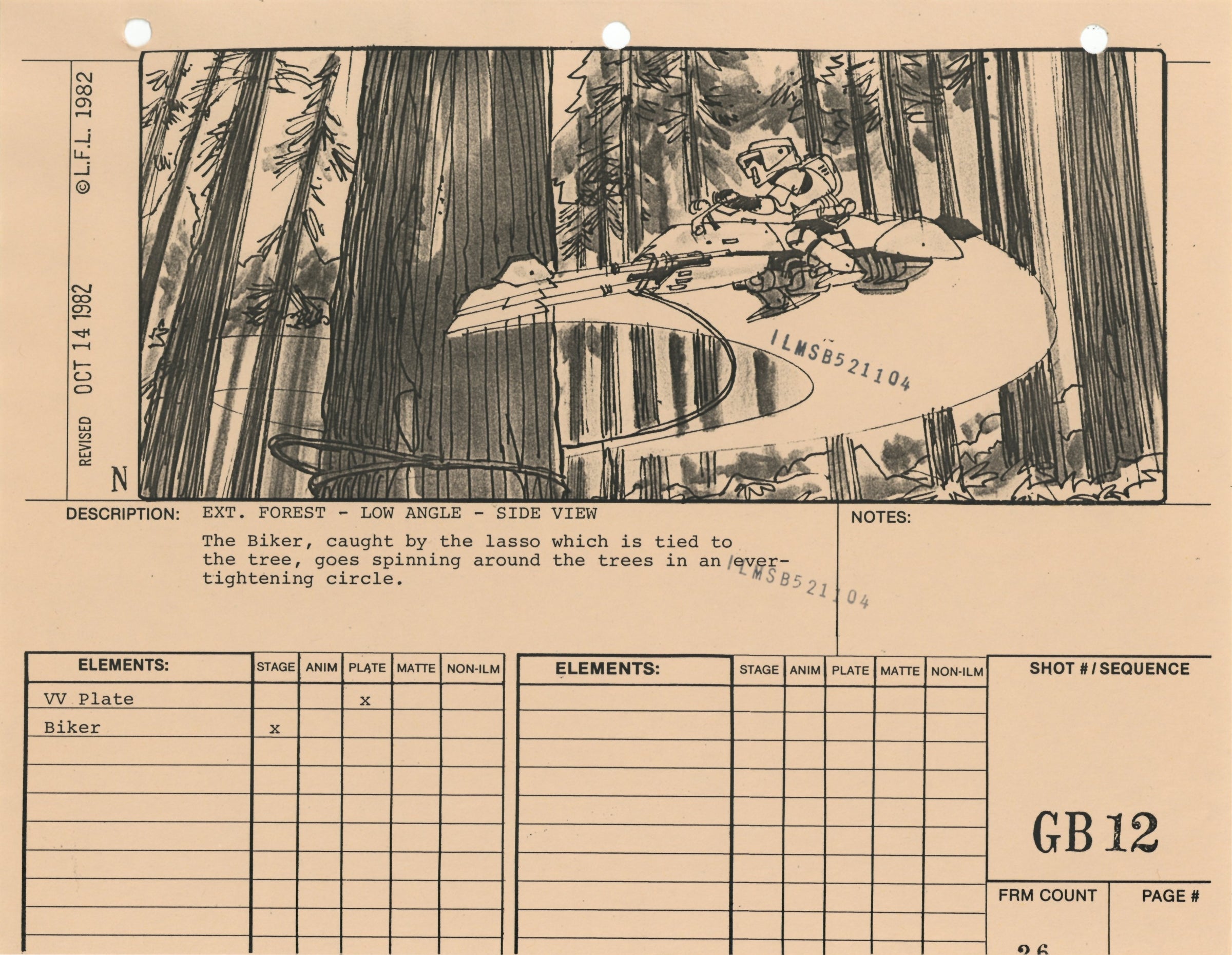 ABOUT THE ARTWORK: This photostat storyboard was used during the production of Star Wars: Episode VI - Return of the Jedi. Please note the two black "ILMSB521104" stamps as well as the 3-ring binder peg holes along the upper margin of this piece. The artist, Nilo Rodis-Jamero, is denoted by the "N" near the lower left corner of the image. Rodis-Jamero was the assistant art director of visual effects for Star Wars: Episode V - The Empire Strikes Back and costume designer for Star Wars: Episode VI - Return of the Jedi.