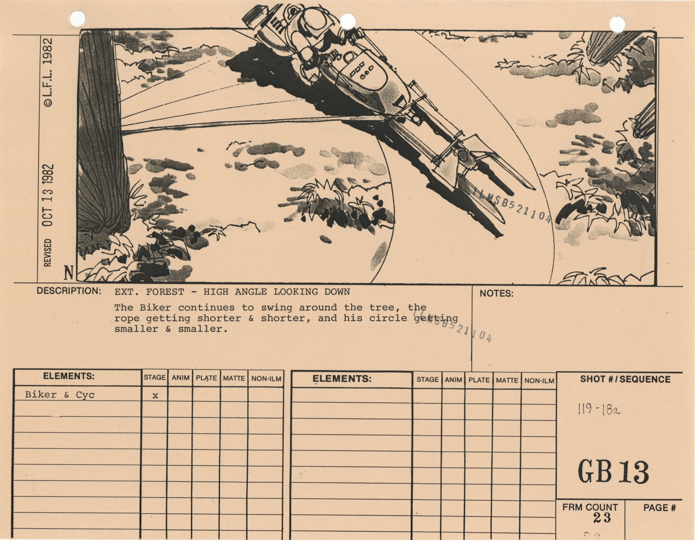ABOUT THE ARTWORK: This photostat storyboard was used during the production of Star Wars: Episode VI - Return of the Jedi. Please note the two black "ILMSB521104" stamps as well as the 3-ring binder peg holes along the upper margin of this piece. The artist, Nilo Rodis-Jamero, is denoted by the "N" near the lower left corner of the image. Rodis-Jamero was the assistant art director of visual effects for Star Wars: Episode V - The Empire Strikes Back and costume designer for Star Wars: Episode VI - Return of the Jedi.