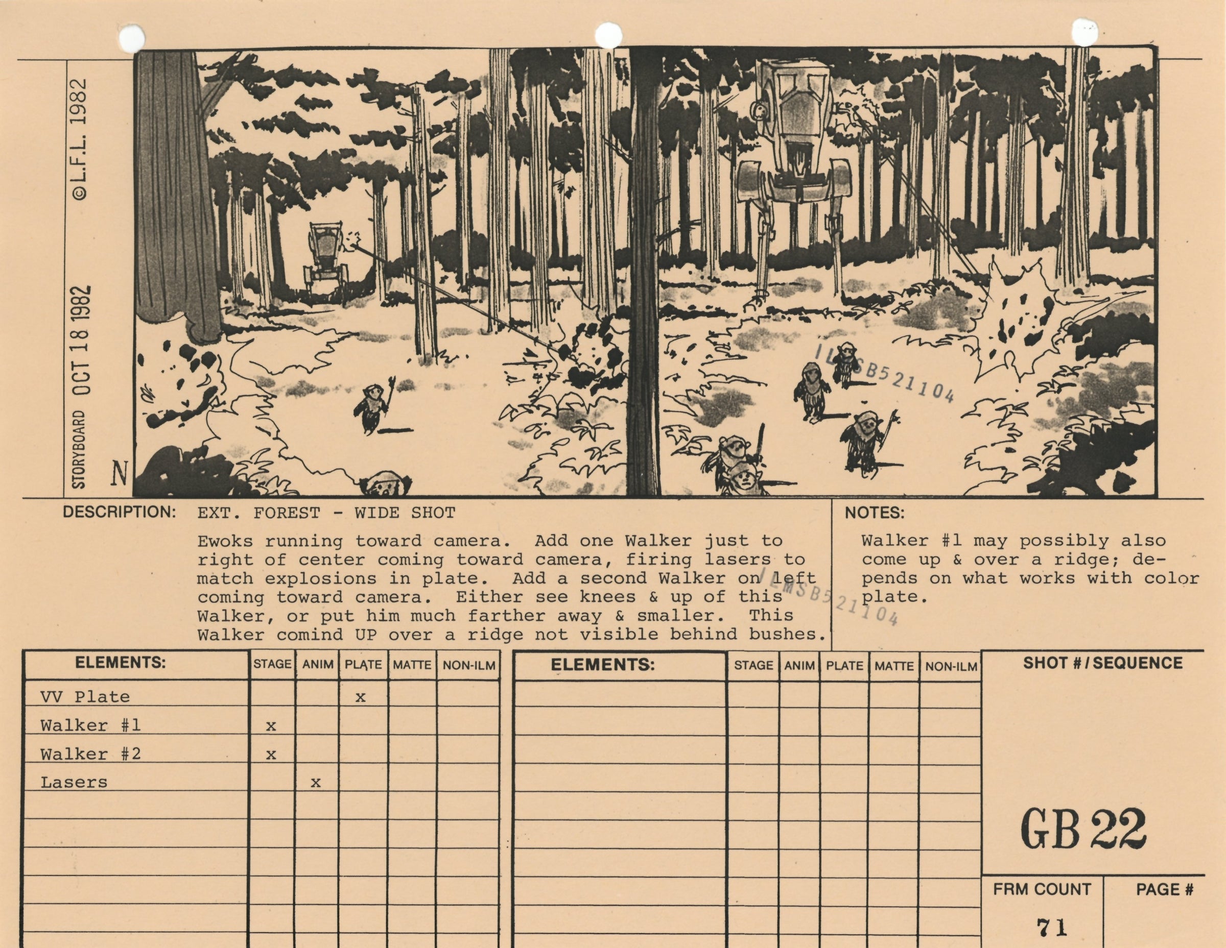 ABOUT THE ARTWORK: This photostat storyboard was used during the production of Star Wars: Episode VI - Return of the Jedi. Please note the two black "ILMSB521104" stamps as well as the 3-ring binder peg holes along the upper margin of this piece. The artist, Nilo Rodis-Jamero, is denoted by the "N" near the lower left corner of the image. Rodis-Jamero was the assistant art director of visual effects for Star Wars: Episode V - The Empire Strikes Back and costume designer for Star Wars: Episode VI - Return of the Jedi.