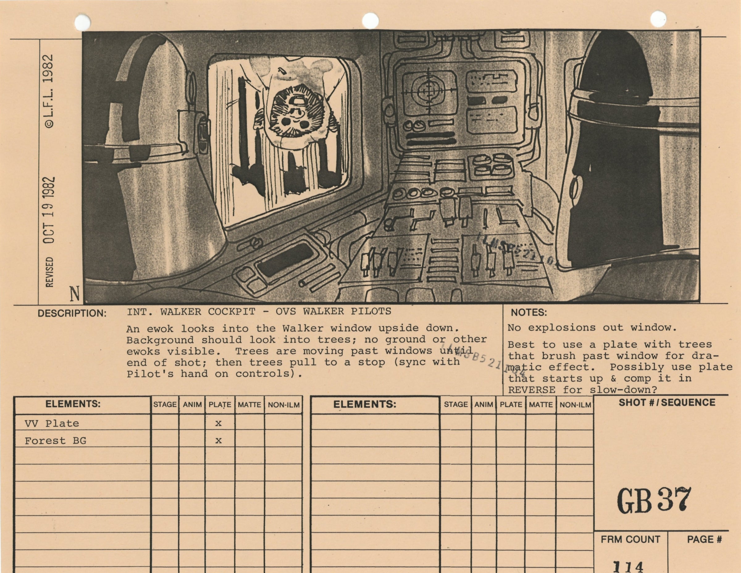 ABOUT THE ARTWORK: This photostat storyboard was used during the production of Star Wars: Episode VI - Return of the Jedi. Please note the two black "ILMSB521104" stamps as well as the 3-ring binder peg holes along the upper margin of this piece. The artist, Nilo Rodis-Jamero, is denoted by the "N" near the lower left corner of the image. Rodis-Jamero was the assistant art director of visual effects for Star Wars: Episode V - The Empire Strikes Back and costume designer for Star Wars: Episode VI - Return of the Jedi.