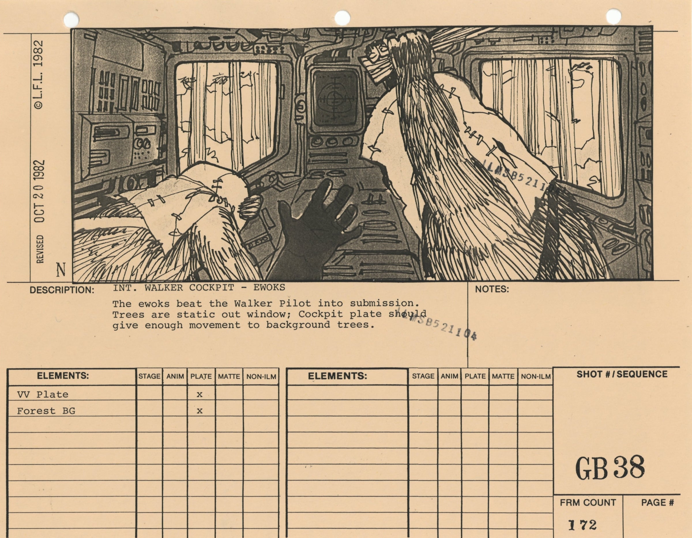 ABOUT THE ARTWORK: This photostat storyboard was used during the production of Star Wars: Episode VI - Return of the Jedi. Please note the two black "ILMSB521104" stamps as well as the 3-ring binder peg holes along the upper margin of this piece. The artist, Nilo Rodis-Jamero, is denoted by the "N" near the lower left corner of the image. Rodis-Jamero was the assistant art director of visual effects for Star Wars: Episode V - The Empire Strikes Back and costume designer for Star Wars: Episode VI - Return of the Jedi.
