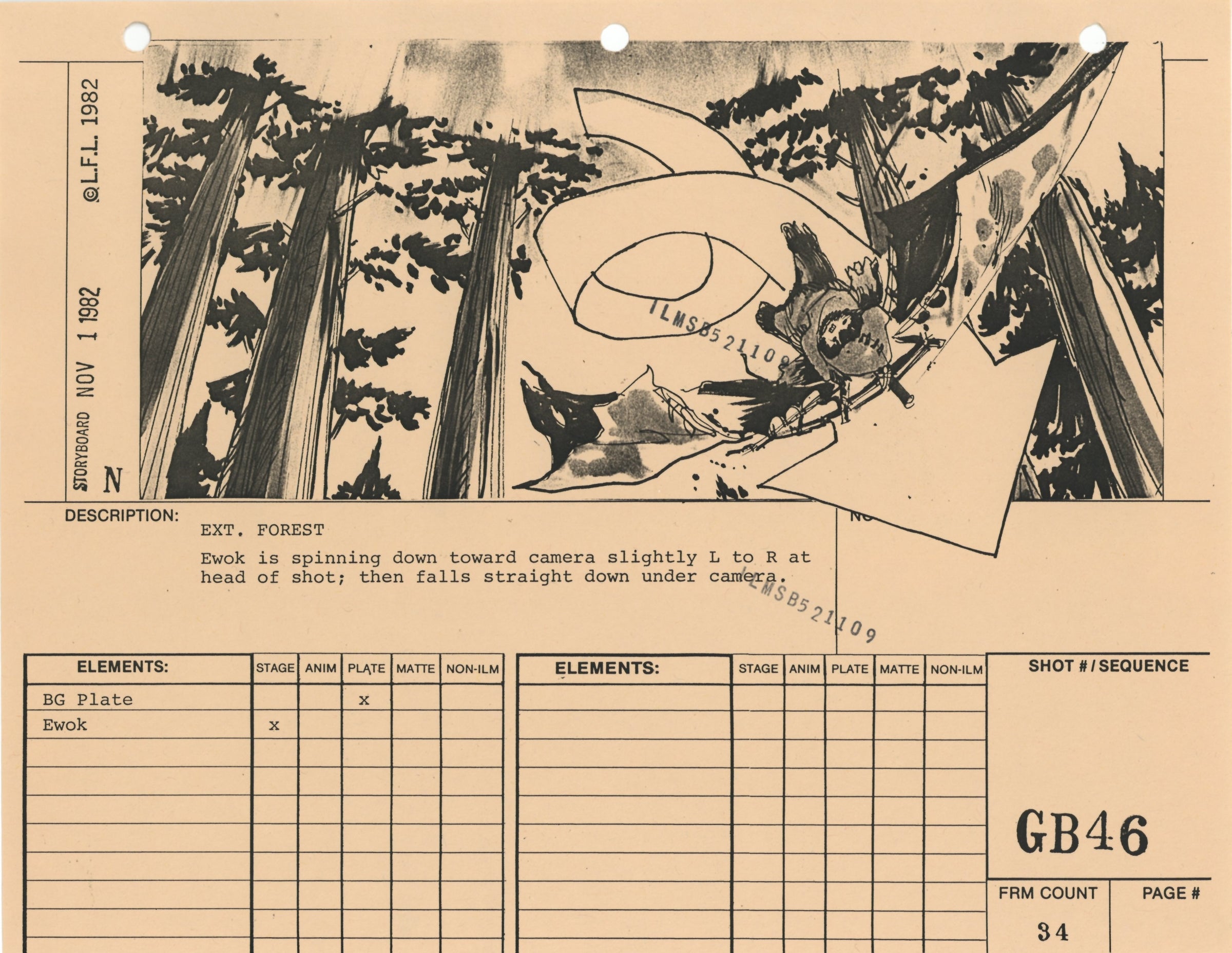ABOUT THE ARTWORK: This photostat storyboard was used during the production of Star Wars: Episode VI - Return of the Jedi. Please note the two black "ILMSB521109" stamps as well as the 3-ring binder peg holes along the upper margin of this piece. The artist, Nilo Rodis-Jamero, is denoted by the "N" near the lower left corner of the image. Rodis-Jamero was the assistant art director of visual effects for Star Wars: Episode V - The Empire Strikes Back and costume designer for Star Wars: Episode VI - Return of the Jedi.