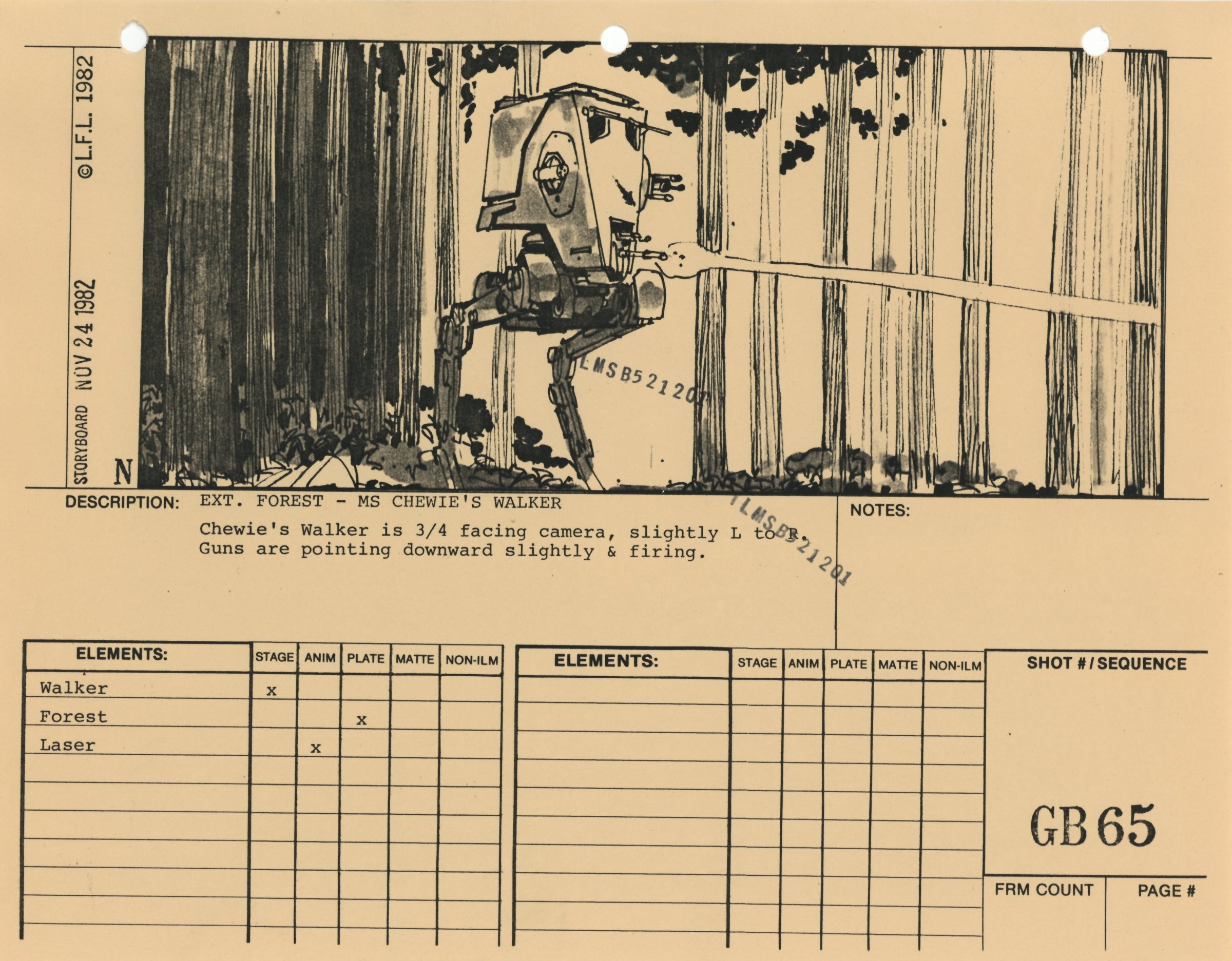 ABOUT THE ARTWORK: This photostat storyboard was used during the production of Star Wars: Episode VI - Return of the Jedi. Please note the two black "ILMSB521201" stamps as well as the 3-ring binder peg holes along the upper margin of this piece. The artist, Nilo Rodis-Jamero, is denoted by the "N" near the lower left corner of the image. Rodis-Jamero was the assistant art director of visual effects for Star Wars: Episode V - The Empire Strikes Back and costume designer for Star Wars: Episode VI - Return of the Jedi.