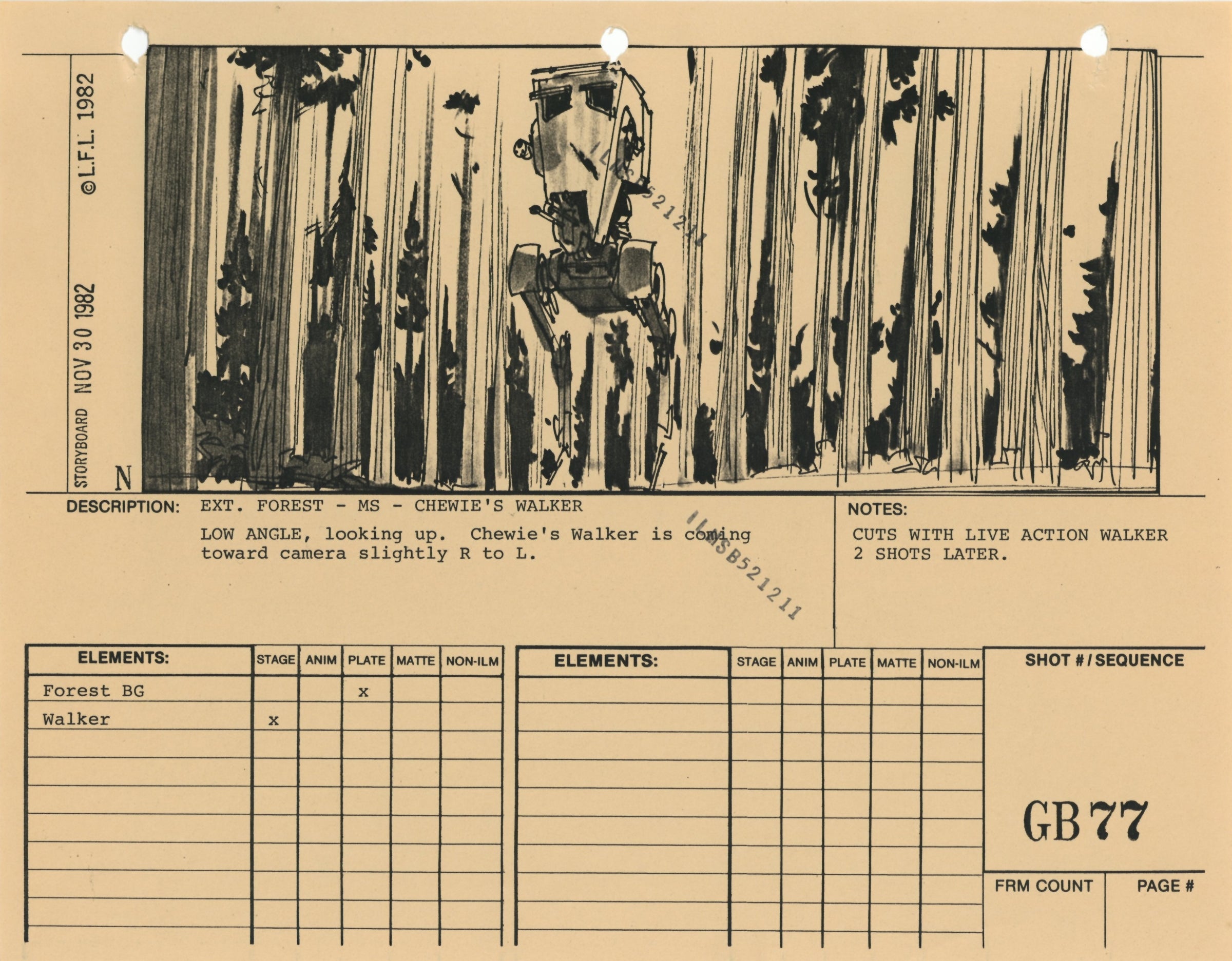 ABOUT THE ARTWORK: This photostat storyboard was used during the production of Star Wars: Episode VI - Return of the Jedi. Please note the two black "ILMSB521211" stamps, as well as the 3-ring binder peg holes along the upper margin of this piece. The artist, Nilo Rodis-Jamero, is denoted by the "N" near the lower left corner of the image. Rodis-Jamero was the assistant art director of visual effects for Star Wars: Episode V - The Empire Strikes Back and costume designer for Star Wars: Episode VI - Return of the Jedi.