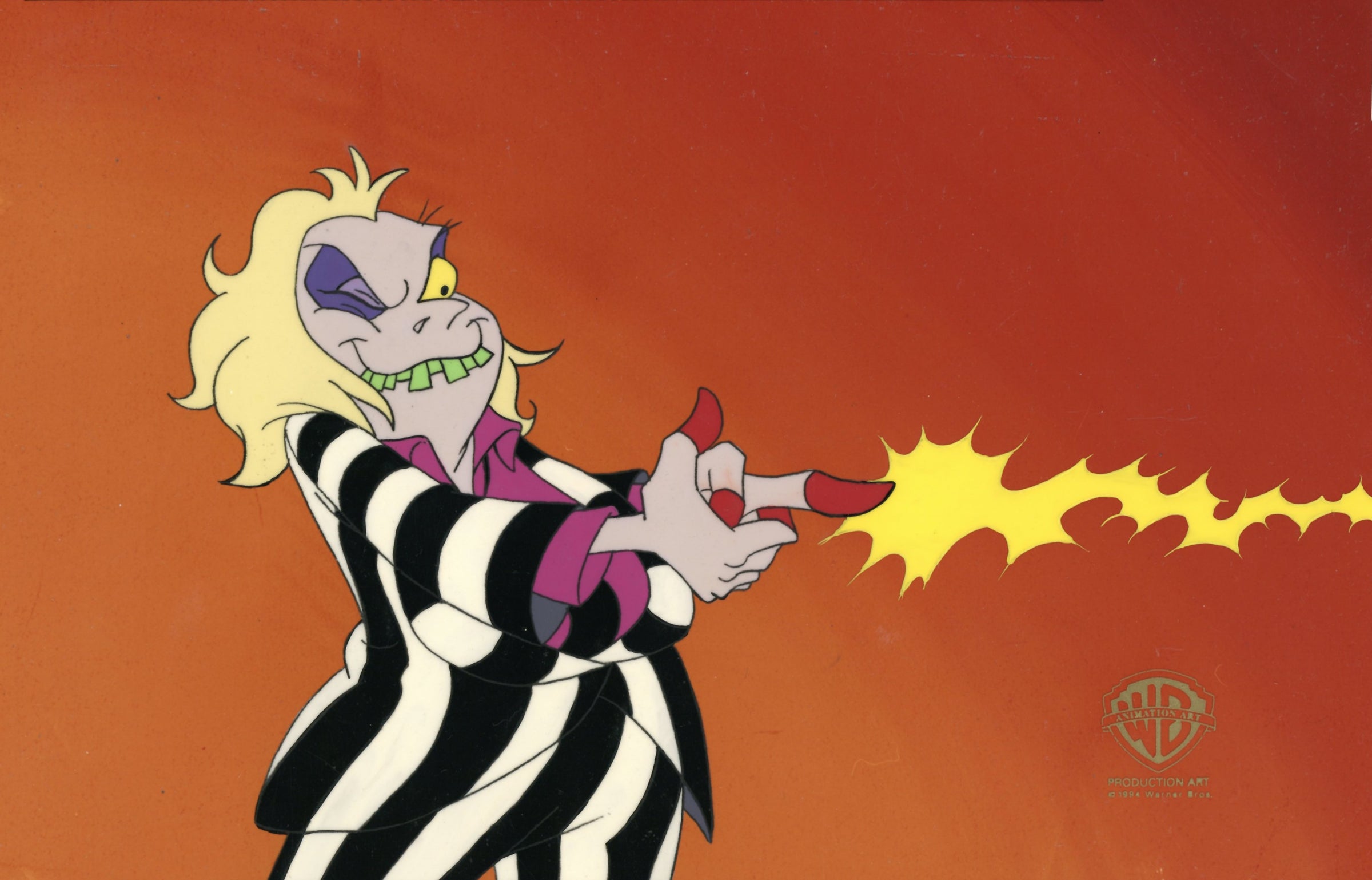 ABOUT THE IMAGE: Beetlejuice: The Animated Series based on on the first Beetlejuice film in 1988; centers around the friendly, but somewhat scheming, Beetlejuice. With encounters from his Gothic best friend Lydia and her parents Delia Deetz and Charles Deetz. Beetlejuice resides in the Neitherworld while Lydia lives in the Living World with her family. The majority of episodes focus around Beetlejuice having a plot or scheme in the works, often inspired by events in Lydia's life. Lydia frequently serves as the voice of reason and assists Beetlejuice when everything gets out of hand. This piece comes with a certificate of authenticity.