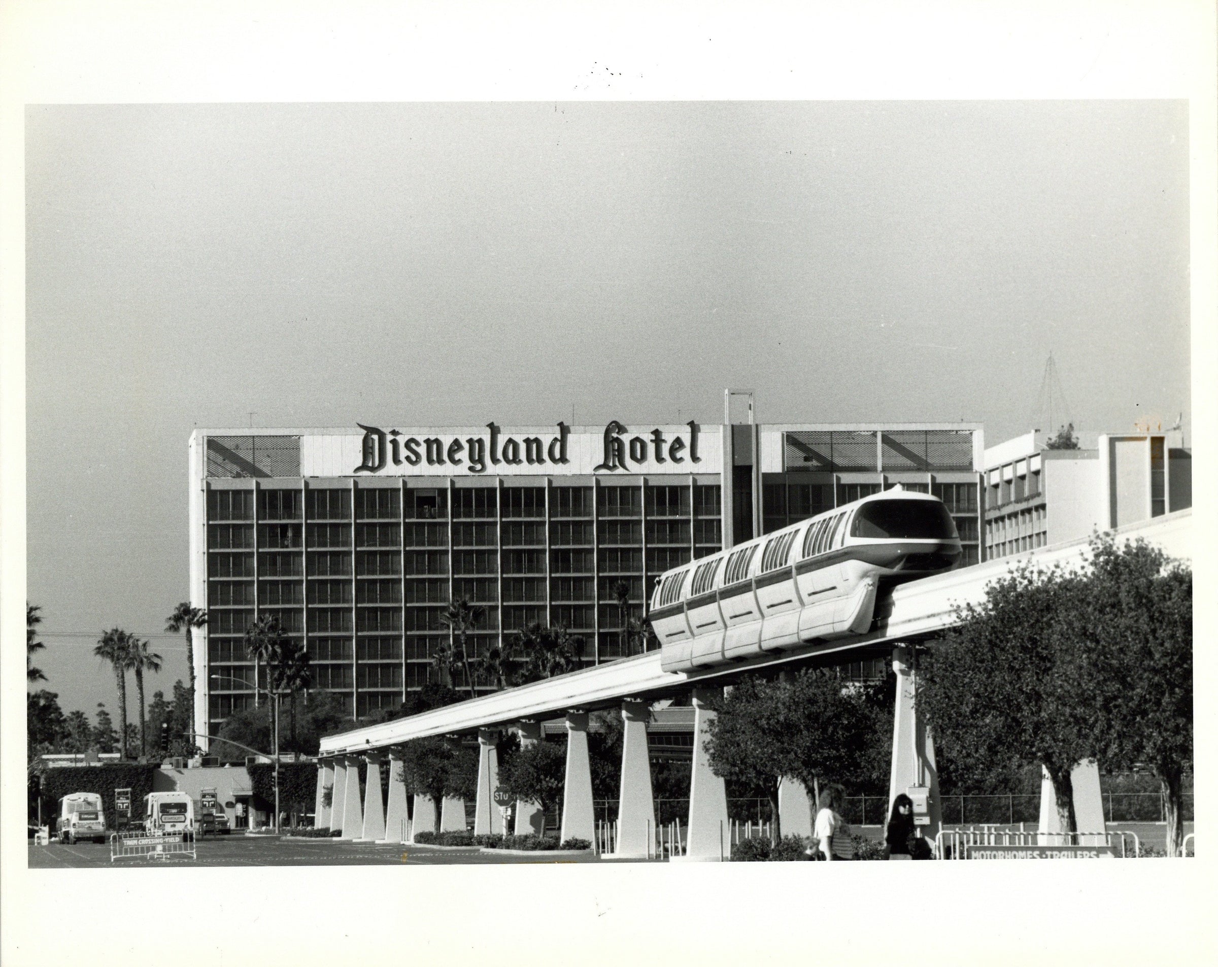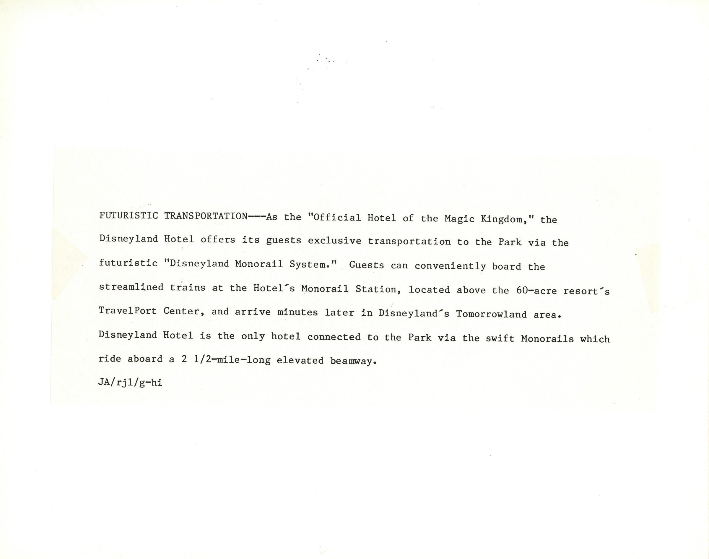 ABOUT THE IMAGE: "FUTURISTIC TRANSPORTATION -- As the "Official Hotel of the Magic Kingdom," the Disneyland Hotel offers its guests exclusive transportation to the Park via the futuristic "Disneyland Monorail System." Guests can conveniently board the streamlined trains at the Hotel's Monorail Station, located above the 60-acre resort's TravelPort Center, and arrive minutes later in Disneyland's Tomorrowland area. Disneyland Hotel is the only hotel connected to the Park via the swift Monorails which ride aboard a 2 1/2-mile-long elevated beamway."