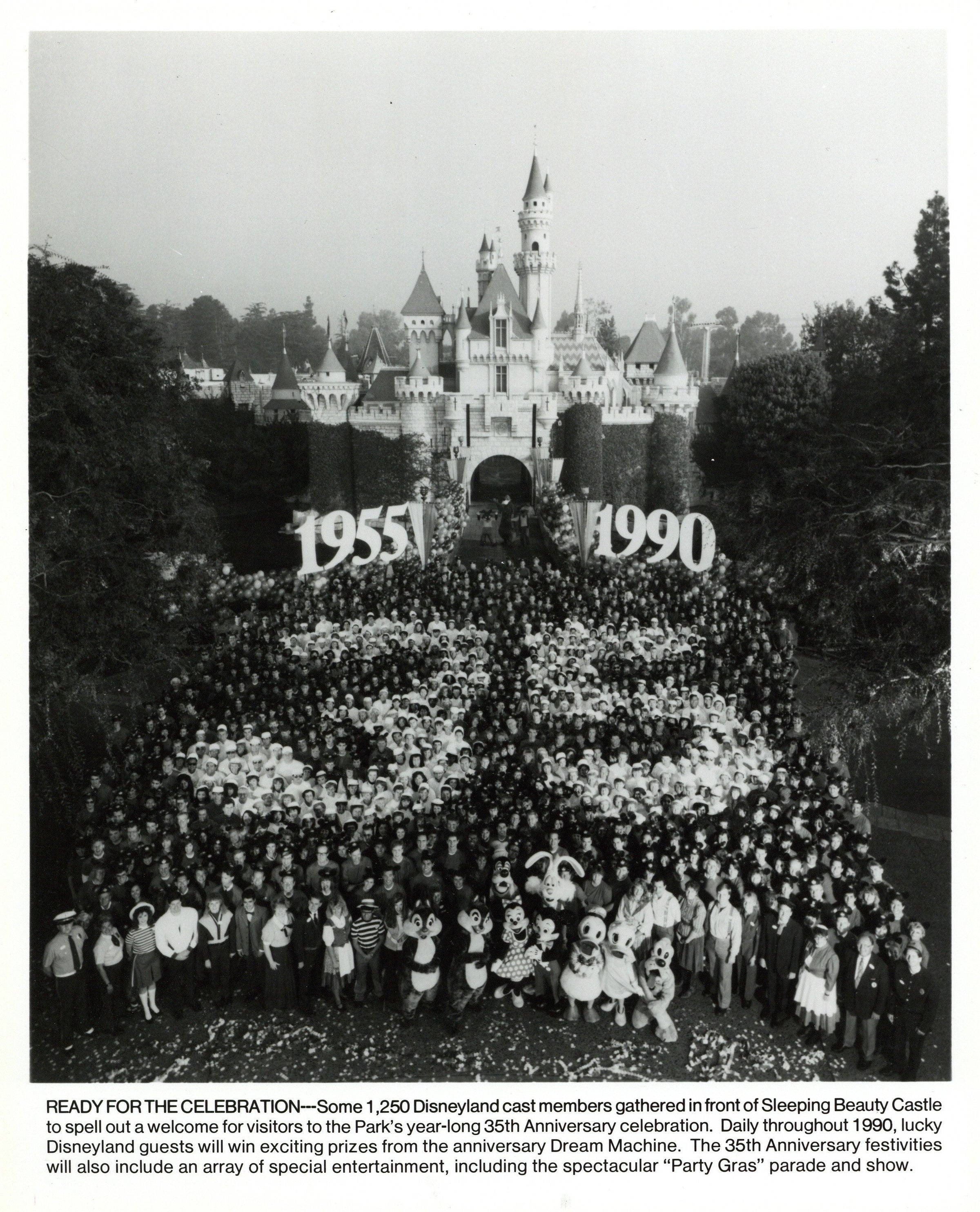 ABOUT THE IMAGE: READY FOR THE CELEBRATION---Some 1,250 Disneyland cast members gathered in front of Sleeping Beauty Castle to spell out a welcome for visitors to the Park's year-long 35th Anniversary celebration. Daily throughout 1990, lucky Disneyland guests will win exciting prizes from the anniversary Dream Machine. The 35th Anniversary festivities will also include an array of special entertainment, including the spectacular "Party Gras" parade and show.