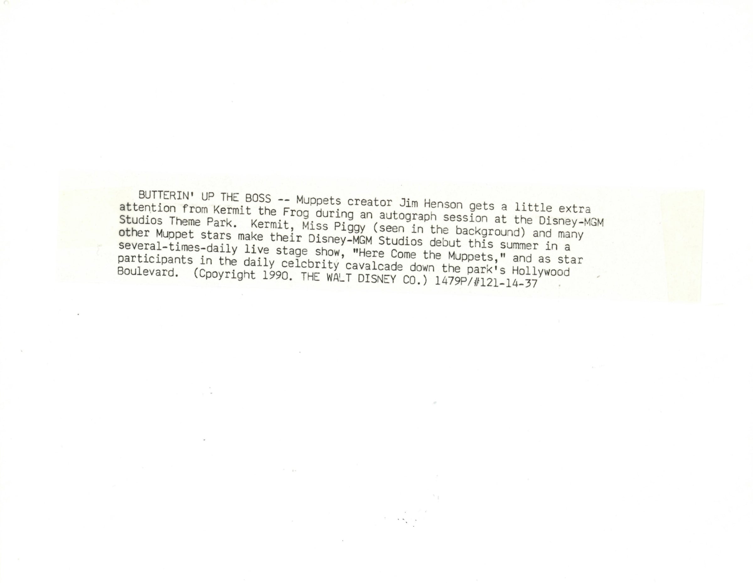 ABOUT THE IMAGE: "BUTTERIN' UP THE BOSS -- Muppets creator Jim Henson gets a little extra attention from Kermit the Frog during an autograph session at the Disney-MGM Studios Theme Park. Kermit, Miss Piggy (seen in the background), and many other Muppet stars make their Disney-MGM Studios debut this summer in a several-times-daily live stage show, "Here Come the Muppets," and as star participants in the daily celebrity cavalcade down the park's Hollywood Boulevard."