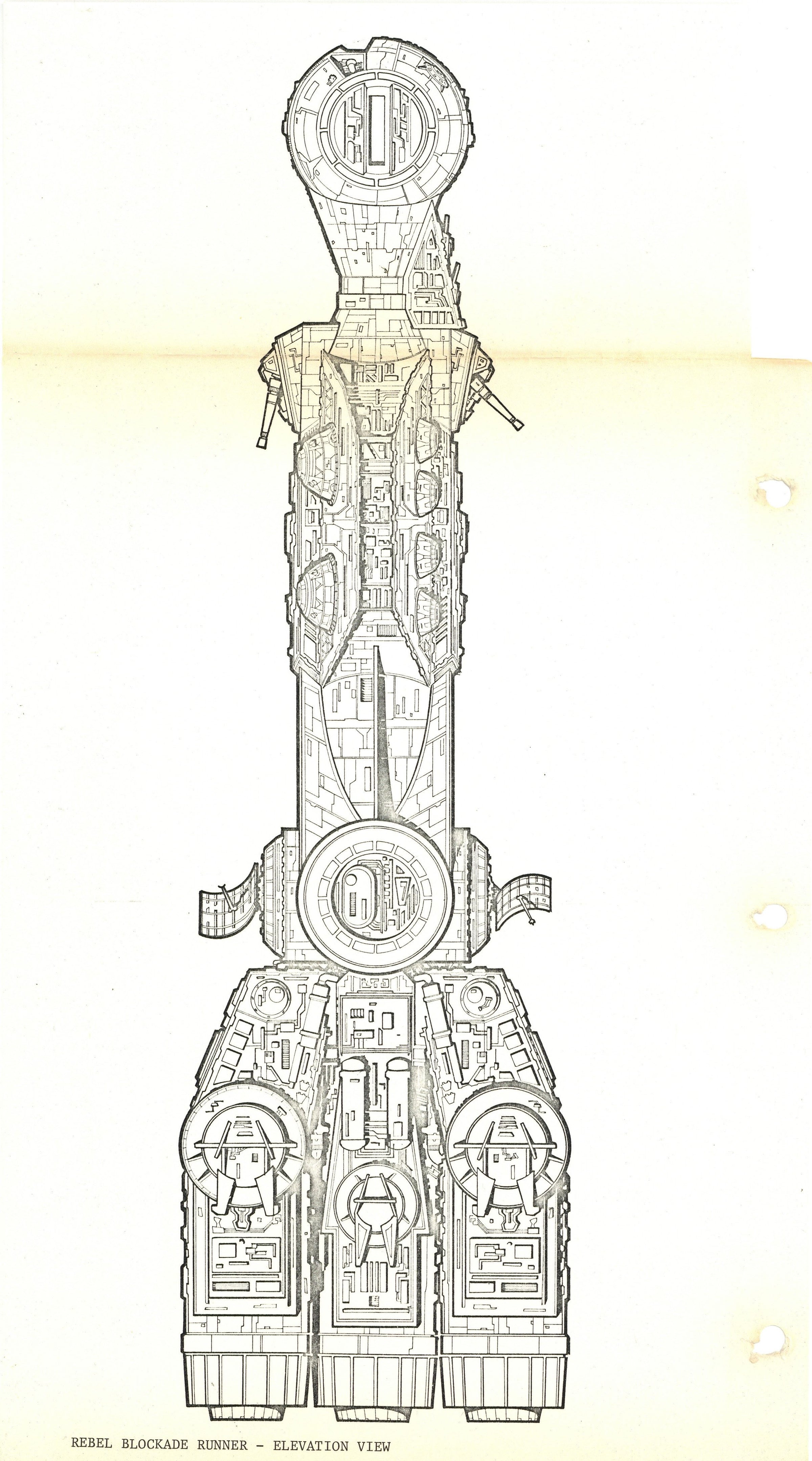 ABOUT THE IMAGE: This photostat print was used during the production of Star Wars: Episode V - The Empire Strikes Back. In this side view engineering elevation of a Rebel Blockade Runner, you can see a detailed layout of the ship's exterior including features such as the bridge, turbolaser cannons, escape pods, communications array, and engines. Please note the 3-ring binder peg holes on the right margin of this piece.