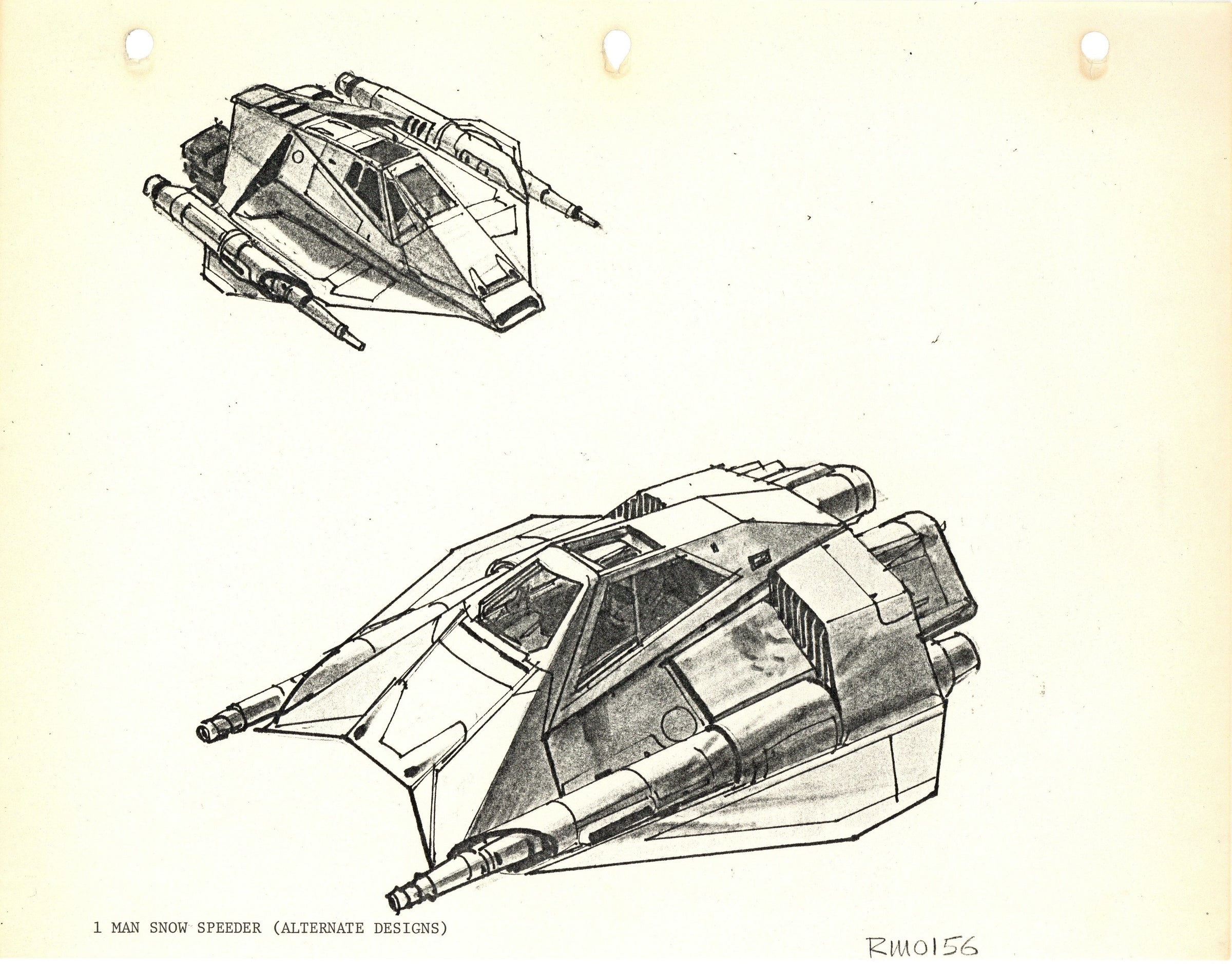 ABOUT THE IMAGE: This photostat print of an original Ralph McQuarrie drawing was used during the production of Star Wars: Episode V - The Empire Strikes Back. It showcases multiple alternate designs for a one-man snow speeder, also known as a T-47 airspeeder. Please note the embedded production code in the lower right corner. There are 3-ring binder peg holes in the upper margins of the piece.