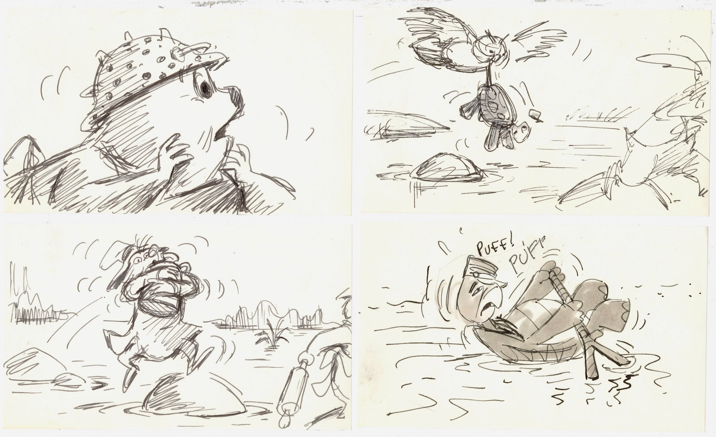 The storyboards were all created by the exceptional writer and story artist Ted Berman (1919 - 2001), who contributed to a variety of Disney films, shorts, and featurettes including The Black Cauldron and The Fox and the Hound. The storyboards and prints were largely created for: the sequence at the beginning of the film with the Rescue Aid Society where Bernard and Bianca are introduced, starting at roughly 6:22; the chase sequence where Madame Medusa, Mr. Snoops, and Medusa's crocodiles hunt Bernard and Bianca, starting at around 46:49; and the fight sequence at about 1:09:31 when Ellie Mae and crew help Bernard and Bianca fight off Madame Medusa.