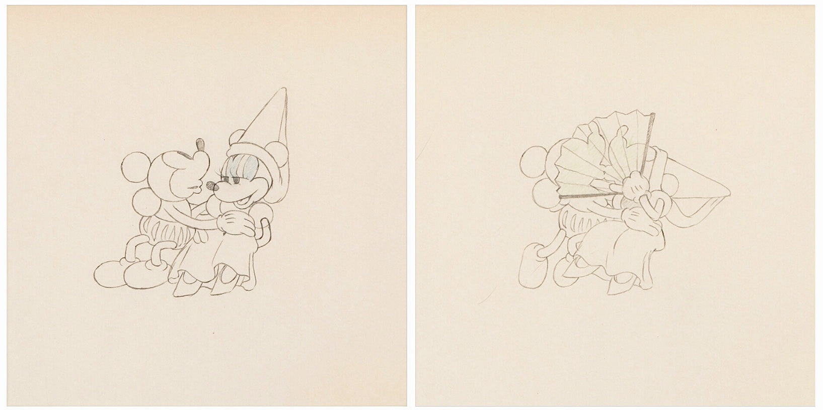 ABOUT THE IMAGE: Mickey Mouse is introduced as "Ye Wandering Minstrel" and Minnie Mouse is "Ye Princess," in the beginning of this cartoon short, a loose takeoff of the novel Ivanhoe. Here is the ultimate Mickey loves Minnie lot! This is from the ending scene, around the 8:07 mark, where Minnie joins Mickey on his donkey and they kiss behind her fan. The short was directed by Burt Gillett and released on 4/8/33.